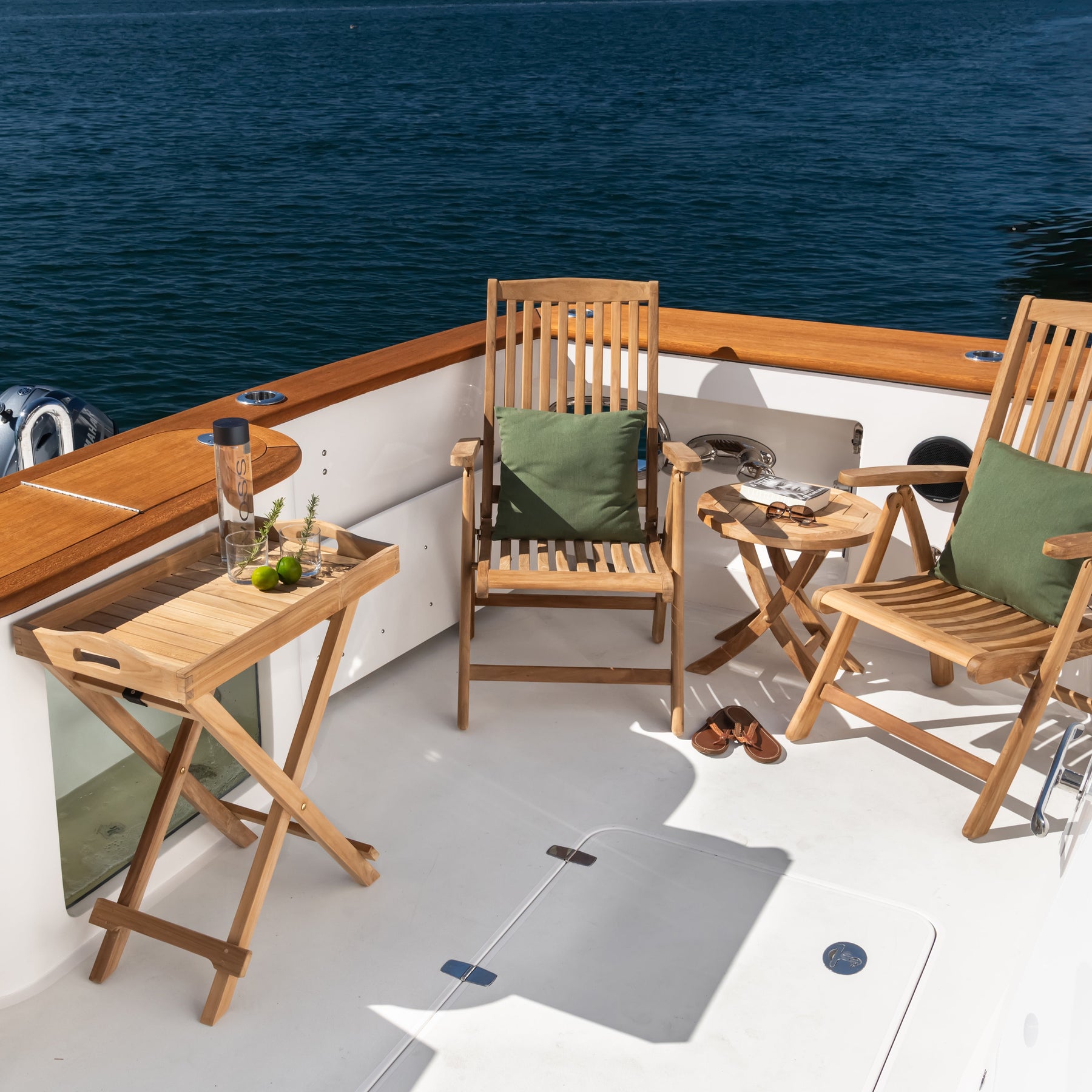 The Tivaro Furniture Serving Tray With Stand is a versatile, elegant addition to any marine vessel. Crafted from high-quality A-grade teak, this durable tray features clean lines and a sleek profile, enhancing any nautical setting with its natural, rich color and smooth surface. The foldable stand provides stability and easy storage, transforming the tray into a convenient table. Perfect for serving food and drinks or displaying decor, this tray is both practical and stylish for life on the water.