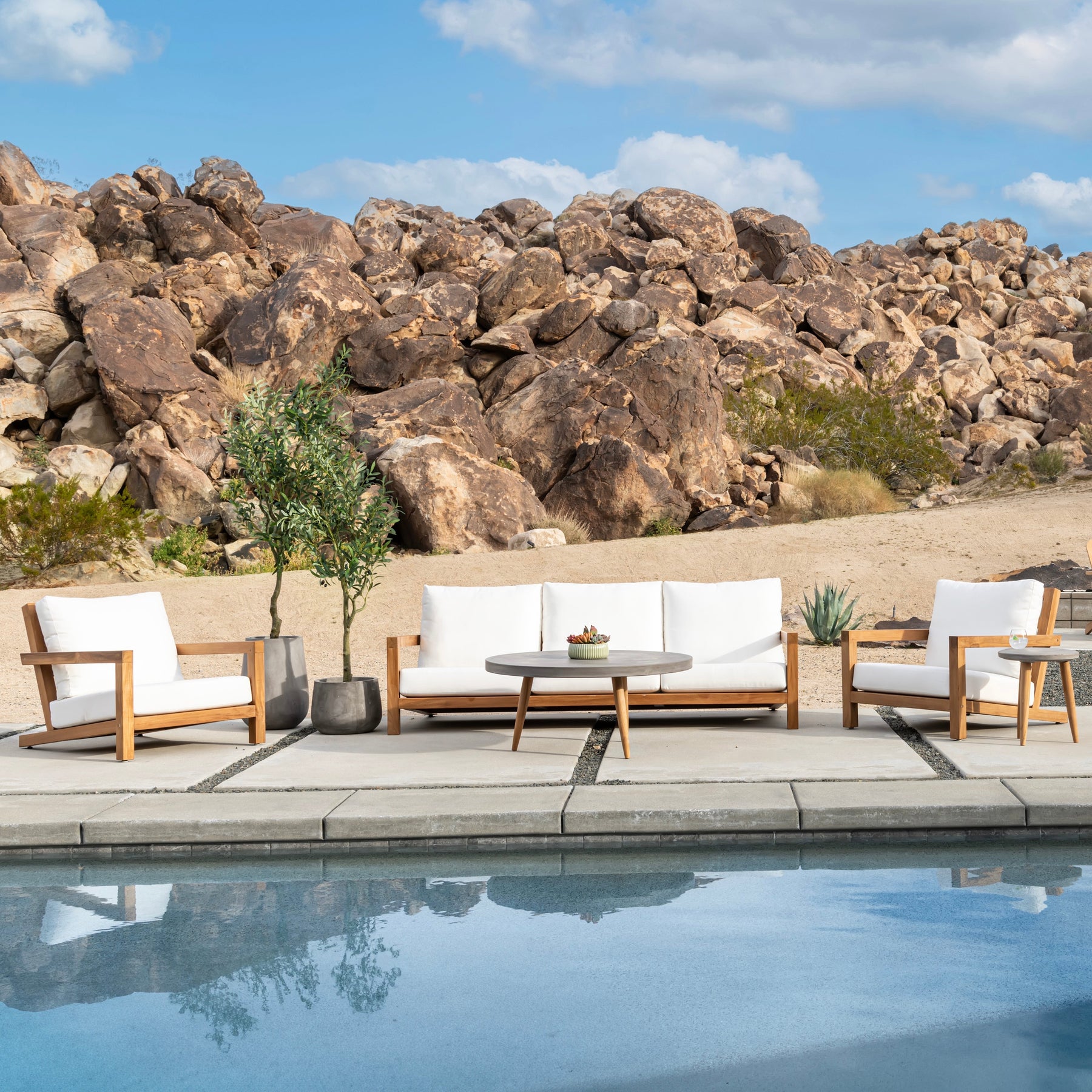 The Aspen Blok Concrete Round Coffee Table is a stunning piece of furniture that combines the durability of concrete with the warmth of A-grade teak wood. Available in both a large and small size, this coffee table is perfect for any space. The round concrete tabletop is not only visually appealing, but also durable and resistant to weathering, making it suitable for outdoor use. The legs of the table are crafted from A-grade teak wood, known for its natural resistance to decay and weathering, which makes this coffee table an excellent choice for outdoor use. The combination of concrete and teak wood gives the Aspen Blok Concrete Round Coffee Table a unique and modern look that is sure to impress. The teak legs add a touch of warmth and elegance to the design, while the concrete tabletop provides a sleek and modern look.