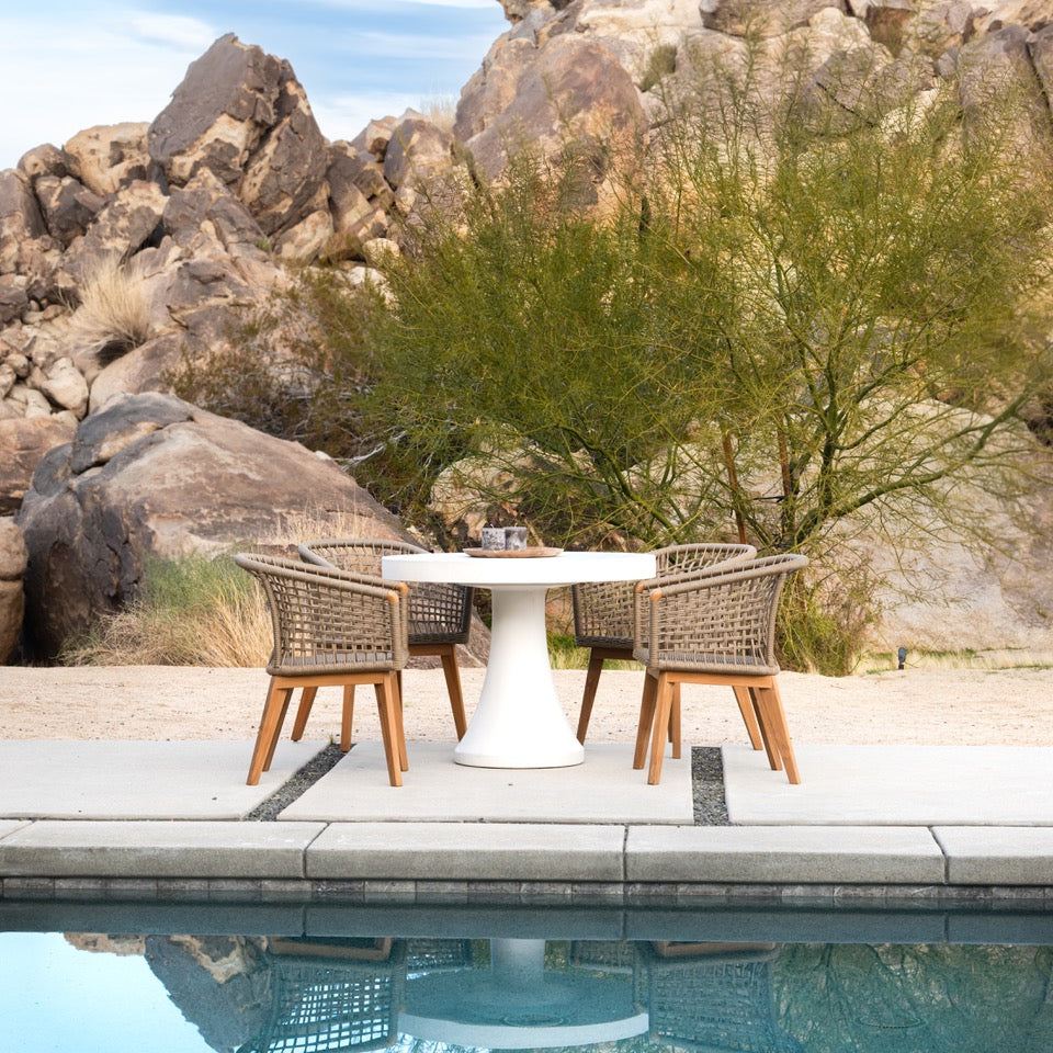 The Blok Round Concrete Dining Table by Tivaro Furniture is a stylish and durable outdoor furniture piece that is sure to make a statement in any outdoor space. Available in two sizes to suit different needs and areas, this table features a thick round top and a flared pedestal base reminiscent of a game piece, giving it a sleek, modern look that adds character and style to any setting. Its unique design makes it a standout piece that will impress. Crafted from poured concrete, this table is built to withstand the elements. Please note that all our concrete products are handmade, meaning no two pieces are exactly alike. Each table may vary slightly in size, enhancing the uniqueness and character of the piece.